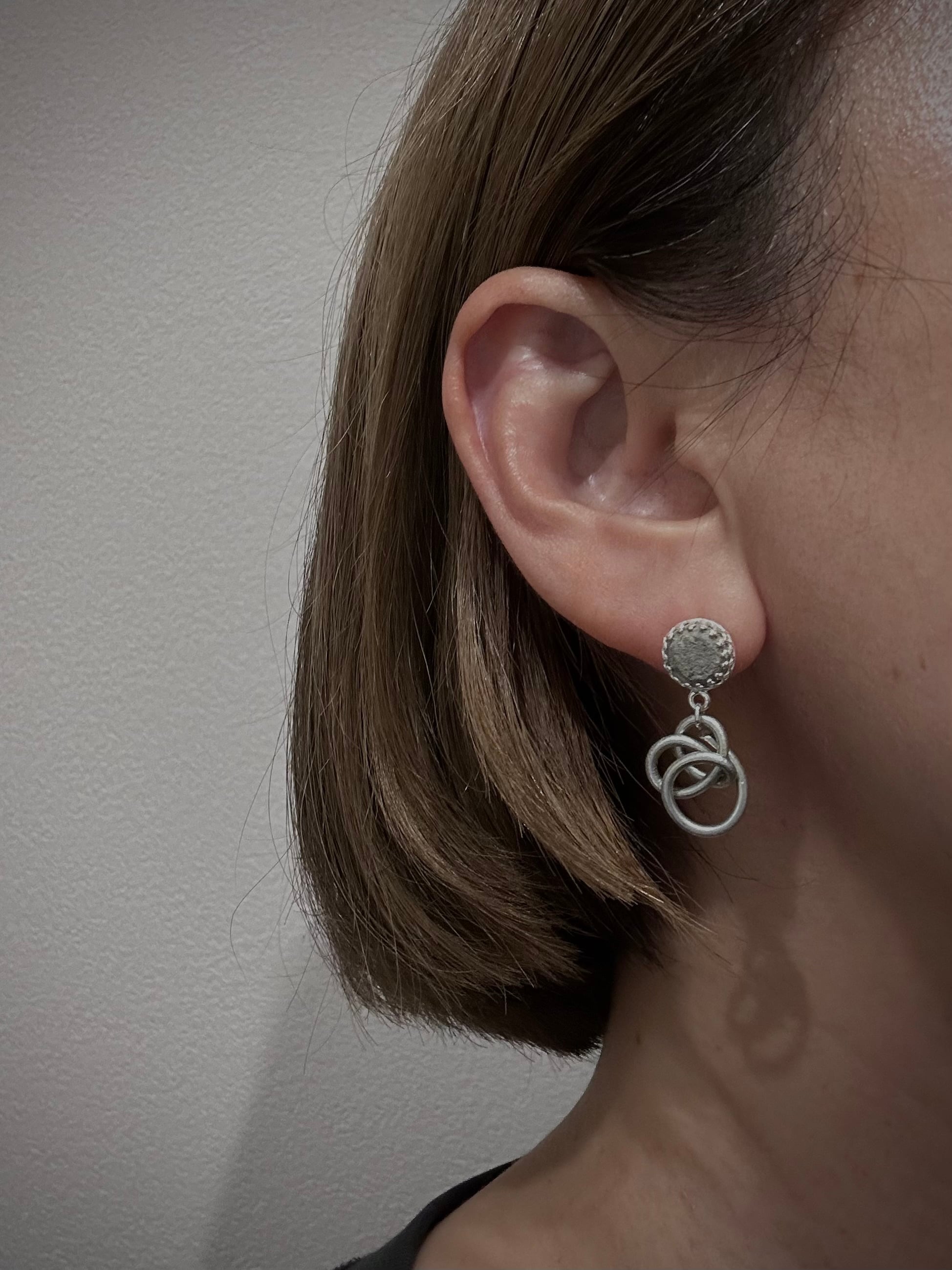 札幌軟石の下に、錫で作ったパーツを組み合わせたピアス、イヤリング。