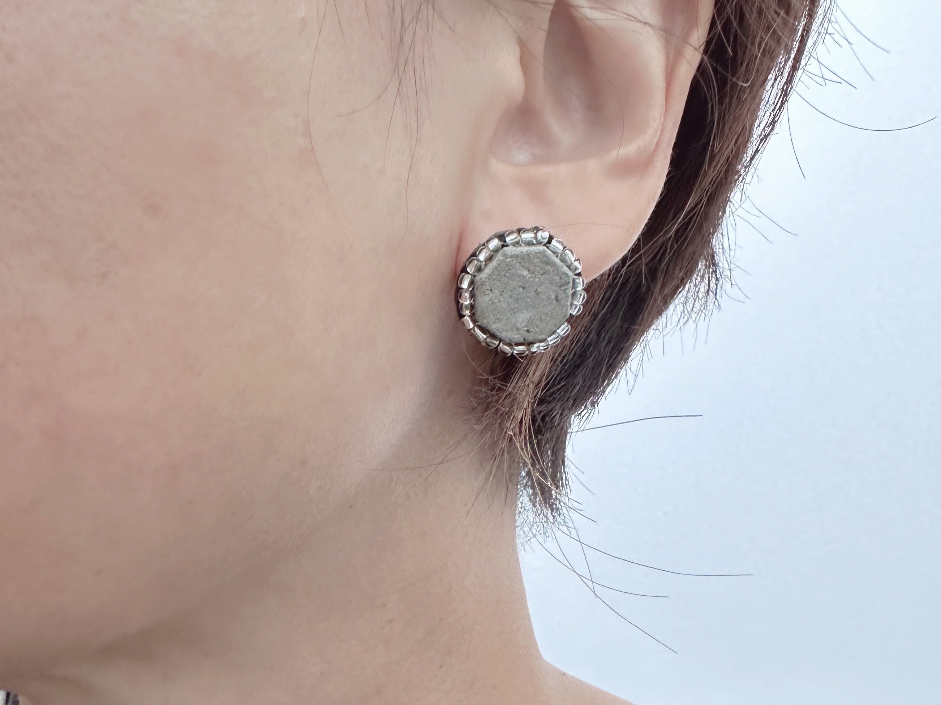 札幌軟石の周りをビーズで囲み、軟石にふわりと積もった雪を表現しているピアス/イヤリングです。